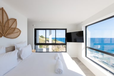 Villa Aqua Vista features six opulent bedrooms, each meticulously designed to deliver supreme comfort and tranquility. The master suite exudes serenity an en-suite bathroom and panoramic sea vistas. The other bedrooms are equally inviting, offering plush furnishings, en-suite bathrooms. Four of the bedrooms are on the ground floor, while the fifth is on the lower level adjacent to the living areas. The sixth bedroom is located on the second lower level and is accessed by an outside staircase, offering a panoramic view of the Caribbean Sea from the bed.