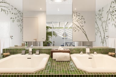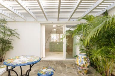 The villa also offers a private studio at the property entrance, providing an additional retreat for guests or staff. The studio is tastefully appointed, offering a comfortable living space.