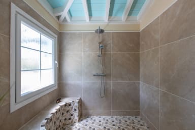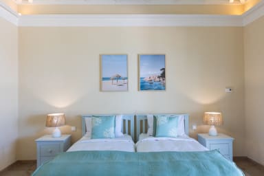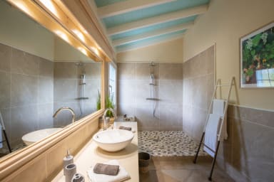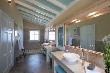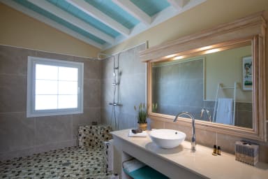Inside the villa, guests will find a spacious and stylishly decorated living area, with an inviting atmosphere with warm colored decor and furnishings, and modern amenities. The villa features four bedrooms, each with its own en-suite bathroom, offering plenty of privacy and comfort for guests. The bedrooms are air-conditioned and feature quality bedding and linens, ensuring a restful night's sleep. Three of the bedrooms, including the master, are located on the main level giving access to the pool and the terrace. The fourth bedroom is on the lower level, accessible from the outside, offering a little more privacy. An ideal option for those who prefer a little more separation from the main living areas of the villa.