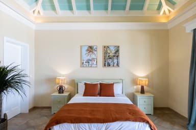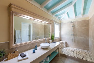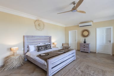 Inside the villa, guests will find a spacious and stylishly decorated living area, with an inviting atmosphere with warm colored decor and furnishings, and modern amenities. The villa features four bedrooms, each with its own en-suite bathroom, offering plenty of privacy and comfort for guests. The bedrooms are air-conditioned and feature quality bedding and linens, ensuring a restful night's sleep. Three of the bedrooms, including the master, are located on the main level giving access to the pool and the terrace. The fourth bedroom is on the lower level, accessible from the outside, offering a little more privacy. An ideal option for those who prefer a little more separation from the main living areas of the villa.