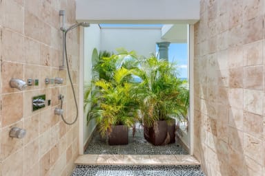The three bedrooms are equal in size, spacious, and comfortable. Each room has private indoor and outdoor seating.The spa bathrooms are stunning in tumbled travertine, Indonesian river rocks and sleek fixtures. Walk in showers flow into outdoor showers with sea views.