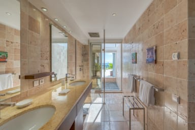 The three bedrooms are equal in size, spacious, and comfortable. Each room has private indoor and outdoor seating.The spa bathrooms are stunning in tumbled travertine, Indonesian river rocks and sleek fixtures. Walk in showers flow into outdoor showers with sea views.