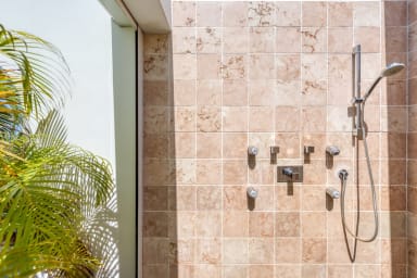 The three bedrooms are equal in size, spacious, and comfortable. Each room has private indoor and outdoor seating.The spa bathrooms are stunning in tumbled travertine, Indonesian river rocks and sleek fixtures. Walk in showers flow into outdoor showers with sea views.