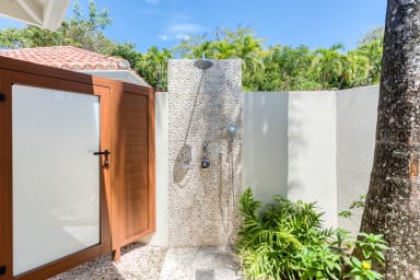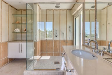 The main level of Villa La Dacha is dedicated to providing a luxurious and convenient living space, featuring three of the five bedrooms with direct access to the inviting infinity pool. Each bedroom is thoughtfully designed to offer a unique and comfortable retreat for guests. Moving to the lower level, accessed via stone staircases, guests will discover two more bedrooms, each with independent outside access. The master suite is a true sanctuary, featuring a king-sized bed, a private terrace, and an en-suite bathroom with lavish amenities. The remaining four bedrooms are equally well-appointed, offering en-suite bathrooms, outdoor showers and stunning vistas.