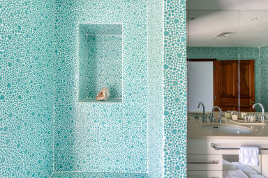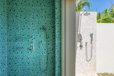 The Moroccan-inspired outdoor living space is a true oasis of tranquility. Decorated with a keen eye for detail, the large sofas provide ample seating for guests to gather and enjoy the breathtaking views of the Caribbean Sea. The ambiance is enriched by the beautiful floor made of colorful mosaic tiles, adding an artistic touch to the space.