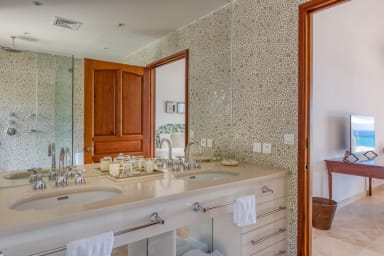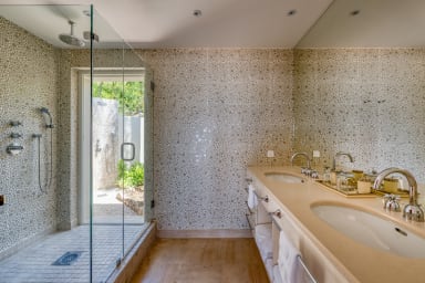 The main level of Villa La Dacha is dedicated to providing a luxurious and convenient living space, featuring three of the five bedrooms with direct access to the inviting infinity pool. Each bedroom is thoughtfully designed to offer a unique and comfortable retreat for guests. Moving to the lower level, accessed via stone staircases, guests will discover two more bedrooms, each with independent outside access. The master suite is a true sanctuary, featuring a king-sized bed, a private terrace, and an en-suite bathroom with lavish amenities. The remaining four bedrooms are equally well-appointed, offering en-suite bathrooms, outdoor showers and stunning vistas.
