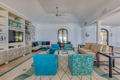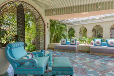 The Moroccan-inspired outdoor living space is a true oasis of tranquility. Decorated with a keen eye for detail, the large sofas provide ample seating for guests to gather and enjoy the breathtaking views of the Caribbean Sea. The ambiance is enriched by the beautiful floor made of colorful mosaic tiles, adding an artistic touch to the space.