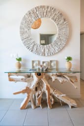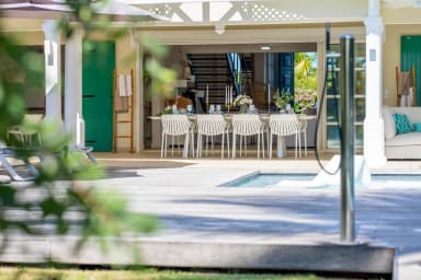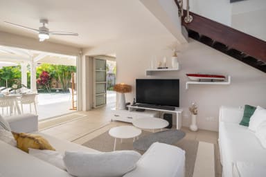 La villa Carib offre un séjour lumineux avec belle hauteur sous plafond, canapés confortables et décoration soignée mêlant esprit ethnique et touches naturelles. De grandes baies vitrées s’ouvrent sur la terrasse et le jardin, prolongeant l’espace de vie vers l’extérieur.