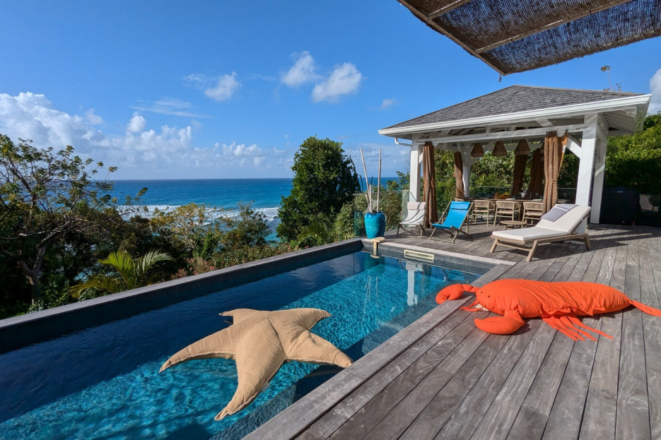 La grande terrasse du rez-de-chaussée est aménagée pour profiter pleinement du cadre naturel. Deux carbets ombragés accueillent un espace repas et un coin apéritif. La piscine est bordée de transats et d’espaces détente, avec une vue imprenable sur la nature et l’océan. À l’étage, la terrasse panoramique est idéale pour admirer le paysage, lire, bronzer ou simplement savourer le calme.