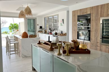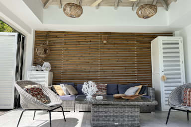 La villa s’ouvre sur un coin bureau et un salon TV prolongé par le salon principal et la salle à manger. La cuisine ouverte, équipée avec soin, inclut une cave à vin et un îlot central. À l’extérieur : une cuisine d’été, plusieurs coins salons, un jardin intimiste et un espace lounge en bout de jardin où le temps semble suspendu. La villa est équipée de la fibre optique, idéale pour le télétravail et le streaming.