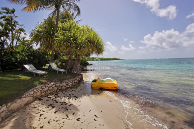 Face au lagon, la villa offre un cadre extérieur exceptionnel. Vous profiterez d’un jardin tropical joliment aménagé, avec transats, parasols et espaces ombragés pour vous détendre au bord de l’eau. Une table ronde et des fauteuils vous permettent de déjeuner ou de prendre l’apéritif les yeux dans le bleu. La terrasse principale abrite un large espace repas et un salon extérieur abrité, idéal pour les longues soirées caribéennes. Un escalier privé mène directement à la petite plage en contrebas.