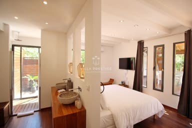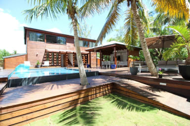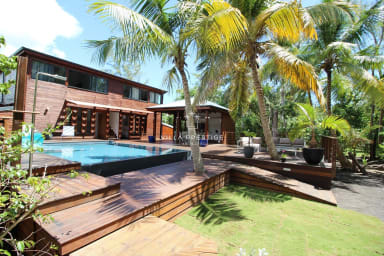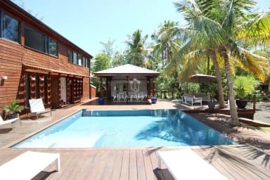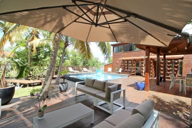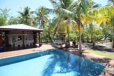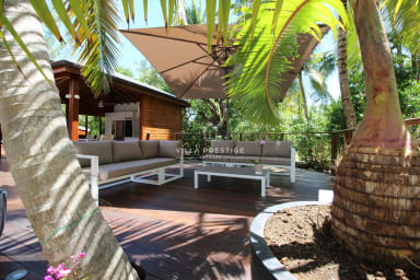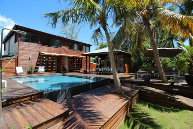 La villa s’organise autour d’une piscine à débordement bordée d’un deck en bois, d’un grand jardin tropical et d’un espace lounge extérieur face à la mer. La cuisine indépendante, entièrement équipée, est ouverte sur le jardin et la piscine, avec un coin repas convivial sous le carbet. Le salon extérieur offre un cadre parfait pour se détendre ou partager un apéritif en fin de journée, au rythme des vagues et des alizés.