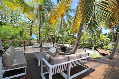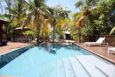 Le jardin tropical mène jusqu’à un vaste deck avec vue imprenable sur la Basse-Terre. Farniente sur les transats, baignades dans la piscine à débordement, ou activités nautiques (kayak, paddle, snorkeling) vous attendent. Un petit bateau à moteur est mis à disposition pour les traversées entre l’îlet et le ponton de stationnement (3 min de traversée).