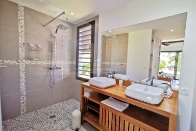 À l’extérieur, profitez d’une magnifique piscine au sel à débordement sécurisée par alarme immergée, d’un salon de jardin, d’une plancha, d’un barbecue charbon et de transats. La villa dispose également d’une douche extérieure, d’équipements de snorkeling, et d’un parking sécurisé avec portail électrique.
