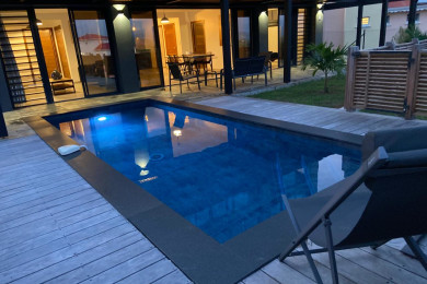 Le tout s’ouvre sur une piscine privative, bordée de transats, idéale pour se détendre tout en admirant le bleu de la mer au loin. Une villa cocon, nichée en bas de maison, sans aucun vis-à-vis, à seulement 200 m des commerces et 6 minutes en voiture des plages de l’Anse Mitan et de la Pointe du Bout.