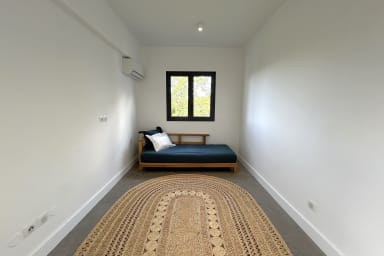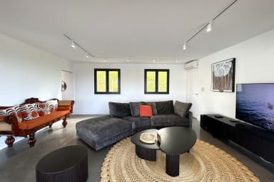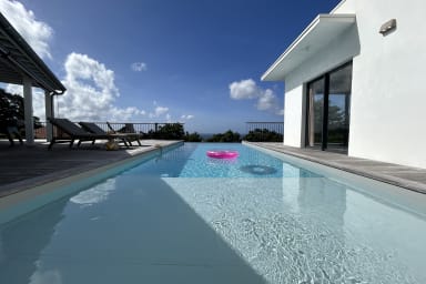 À seulement 15 kilomètres de l’aéroport Aimé Césaire et à 5 minutes en voiture du centre-ville, elle offre un point de départ idéal pour explorer l’île et ses joyaux naturels, dont la Montagne Pelée, récemment classée au patrimoine mondial de l’UNESCO. Les espaces de vie sont ouverts et baignés de lumière : une cuisine haut de gamme entièrement équipée (réfrigérateur américain, cave à vin, four, micro-ondes, plaque à induction, cafetière, lave-vaisselle…) s’ouvre sur une terrasse avec un espace repas et un vaste salon équipé d’une smart TV, le tout donnant sur une superbe piscine à débordement au cœur de la propriété. Les œuvres poétiques de l’artiste Luz Severino subliment les lieux et donnent toute sa personnalité à cette villa inspirante, pensée comme une véritable galerie d’art à ciel ouvert.