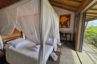 La villa dispose de 4 chambres climatisées, toutes avec salle de bain attenante, dressing ou rangements, et terrasse privée. Trois chambres sont accessibles indépendamment depuis l’extérieur ; la chambre parentale se situe dans la maison principale.