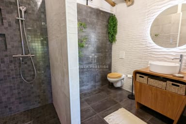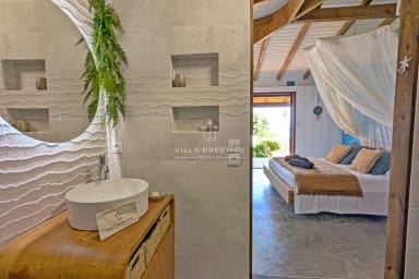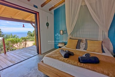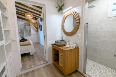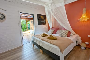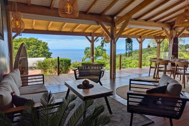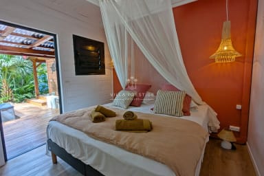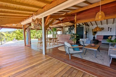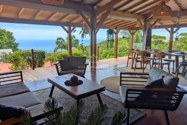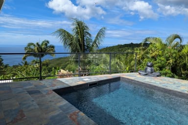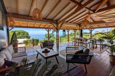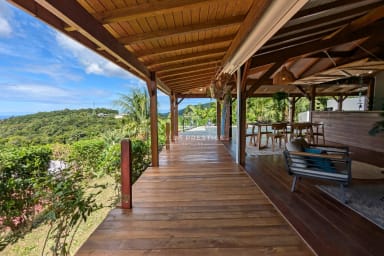 La villa s’ouvre sur une grande terrasse en bois avec piscine au sel, vue mer sans vis-à-vis, transats, hamac, salon extérieur, BBQ charbon, plancha, douche extérieure et un jardin luxuriant où les colibris viennent virevolter. Une citerne d’eau permet de garantir l’autonomie en cas de coupure. Le stationnement est sécurisé par un portail électrique, avec parking extérieur.