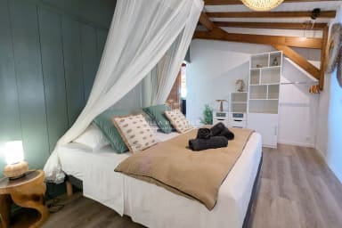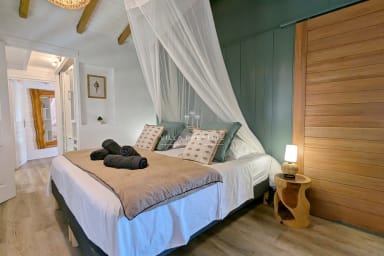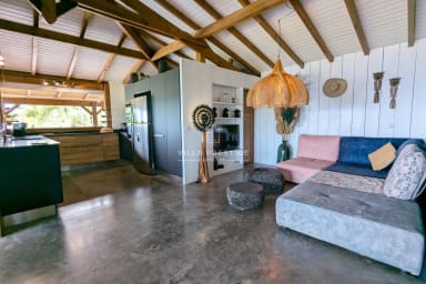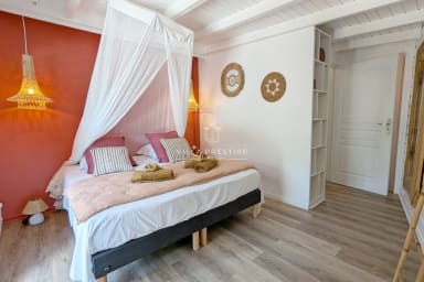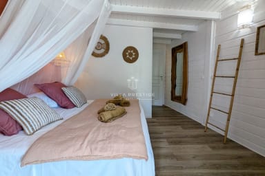 L’espace de vie s’articule autour d’un grand séjour ouvert sur la terrasse, décoré dans un esprit naturel et épuré. Le salon est équipé d’une TV connectée, chaînes TNT, enceinte Bluetooth et WC invités. La cuisine ouverte est entièrement équipée. La salle à manger accueille jusqu’à 6 convives.