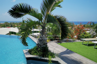 L’immense piscine à débordement borde directement les pièces de vie, créant une belle continuité dedans-dehors. Le jardin paysager accueille plusieurs coins détente : transats avec vue mer, salon ombragé pour l’apéritif, grand carbet aménagé et espace barbecue. Un jacuzzi vous attend également pour vos moments de relaxation.