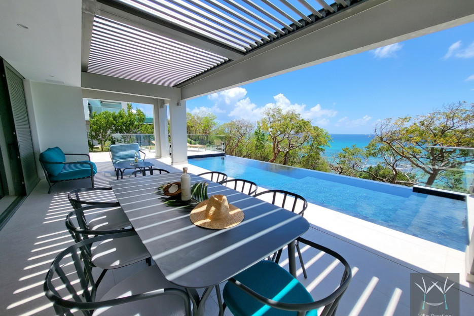 La terrasse prolonge harmonieusement les espaces intérieurs vers l’extérieur. Vous y trouverez une table à manger abritée sous pergola, un salon extérieur, ainsi que plusieurs bains de soleil disposés autour de la piscine avec une vue panoramique spectaculaire sur la mer.