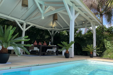 La villa s’ouvre sur une grande terrasse couverte et conviviale, équipée d’une table à manger et d’un barbecue pour vos repas en plein air. Vous pourrez profiter d’une piscine privée de 5x3 m, entourée d’un jardin luxuriant et d’un carbet ombragé offrant une magnifique vue sur la campagne et la mer au loin. Un cadre idéal pour se détendre et savourer la douceur des Caraïbes.