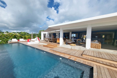 La terrasse de plus de 100 m² offre une vue imprenable sur la mer et l’aérodrome de Saint-François. L’espace extérieur comprend une piscine de 16 mètres, un espace repas, un salon extérieur cosy avec de grands fauteuils et canapés, ainsi qu’une baignoire extérieure avec vue sur l’horizon.