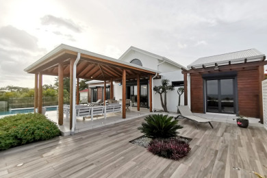 La terrasse offre une vue mer à couper le souffle. Le carbet aménagé avec salon et coin repas abrité devient naturellement le cœur de la villa. L’ambiance extérieure, paisible et dégagée, invite à la déconnexion. Le quartier du Helleux est calme et résidentiel, avec un accès à pied à la plage de surf de Gros Sable.
