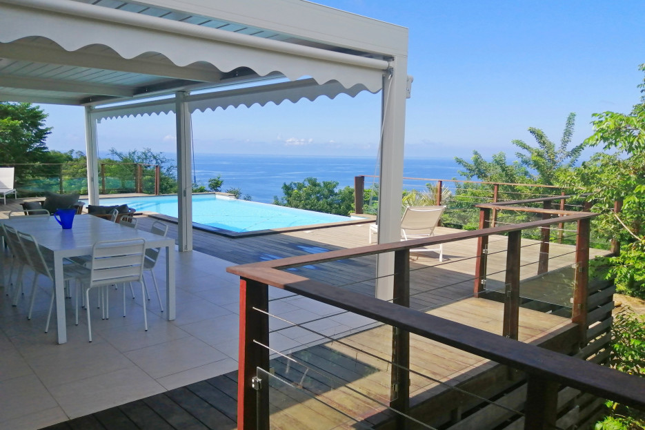 La grande terrasse sans vis-à-vis surplombe la mer et invite à la détente avec ses transats et sa piscine à débordement, parfaite pour admirer les couchers de soleil. En pleine immersion dans la végétation tropicale, le lieu séduira les amateurs de nature et de déconnexion.