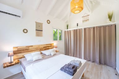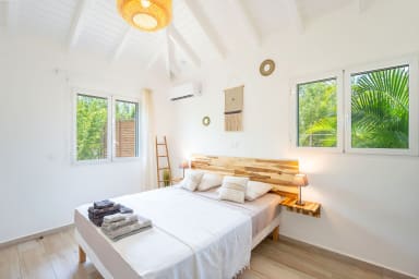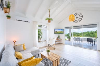 Sur les hauteurs du Gosier, dans un lotissement sécurisé, la Villa Tichadou Duo Prestige est un véritable cocon romantique pour deux personnes. Offrant une vue panoramique sur la mer et un canyon végétal luxuriant, cette villa neuve de 45 m² est idéale pour une escapade à deux mêlant confort, intimité et sérénité. À seulement 8 minutes de la Marina et des plages, c’est une adresse confidentielle et raffinée pour explorer les deux îles.