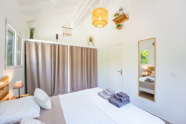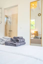 La villa s’ouvre sur un agréable séjour cathédrale climatisé, équipé d’une TV connectée avec Netflix et Wifi fibre. La cuisine ouverte est entièrement équipée pour vos repas en tête-à-tête. La terrasse couverte de 20 m² prolonge les espaces de vie avec un coin repas, un salon extérieur et une belle vue sur le jardin de 80 m², entièrement privatif.