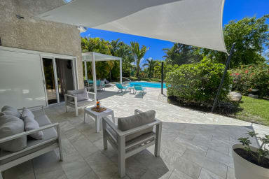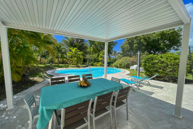 Vous trouverez également une plancha électrique, un salon extérieur et des transats pour profiter pleinement du climat tropical.