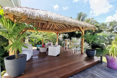 La villa s’ouvre sur un bel espace extérieur, entouré d’un jardin tropical luxuriant. La piscine privée, bordée de transats et de touches colorées, invite à la détente sous le soleil. Une terrasse couverte accueille un salon et un coin repas conviviaux, tandis qu’un carbet en bois, à l’écart, offre un espace lounge intimiste, parfait pour l’apéritif ou un moment de calme.