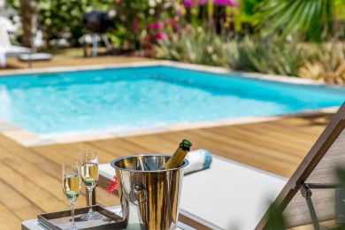 La piscine privée sécurisée, entourée de transats, est parfaite pour se rafraîchir et profiter des journées ensoleillées dans une ambiance tropicale paisible.