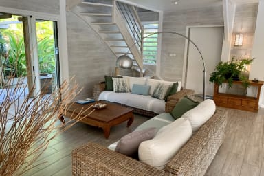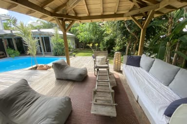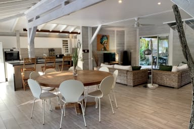 La cuisine est ouverte sur un grand séjour lumineux et traversant, parfaitement ventilé naturellement. Un îlot central permet de partager des repas ou moments conviviaux. L’espace salon, aménagé avec des canapés en rotin et une décoration chaleureuse, prolonge l’ambiance douce et tropicale jusqu’à la terrasse en bois qui borde la piscine.