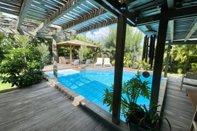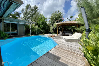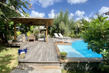 La piscine est bordée d’une belle terrasse en bois et entourée d’une végétation tropicale abondante. Un carbet aménagé ainsi qu’un espace salon extérieur invitent à la détente à toute heure. Le jardin, véritable petit oasis, regorge d’arbres fruitiers : bananes, maracujas, citrons, papayes, barbadines, caramboles, goyaves…