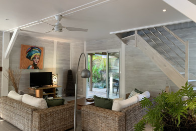 La cuisine est ouverte sur un grand séjour lumineux et traversant, parfaitement ventilé naturellement. Un îlot central permet de partager des repas ou moments conviviaux. L’espace salon, aménagé avec des canapés en rotin et une décoration chaleureuse, prolonge l’ambiance douce et tropicale jusqu’à la terrasse en bois qui borde la piscine.