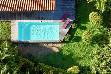 La terrasse en teck s’ouvre sur une piscine au sel (4x4 m), parfaite pour profiter du soleil et se rafraîchir à tout moment de la journée. Le carbet ombragé et son salon de jardin créent un espace convivial, idéal pour des instants de détente et des apéritifs en extérieur.