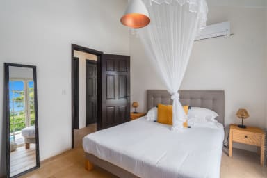La Villa s’ouvre sur une grande terrasse en bois avec piscine privative, plage de bain pour enfants et kit balnéo. Un carbet extérieur abrite un salon de jardin et un espace repas, idéal pour partager des moments conviviaux. Le jardin clos et arboré de plus de 3 000 m² est planté d’essences tropicales (Ylang-Ylang, Eucalyptus, Flamboyant rouge, calebassier).
