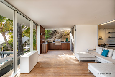 La pièce à vivre est vaste, lumineuse, entièrement ouverte sur l’extérieur. Un salon climatisé confortable vous accueille face à la mer avec un écran escamotable, sublimé par une décoration élégante et artistique. De grandes baies vitrées donnent accès à la terrasse, prolongeant l’espace vers l’infini de l’océan. La cuisine ouverte est entièrement équipée et dispose d’un bar pour vos petits-déjeuners et apéritifs, ainsi qu’un espace repas intérieur et extérieur. La cuisine parfaitement équipée s’ouvre sur la salle à manger située sur la terasse et accueillant une table en bois massif.