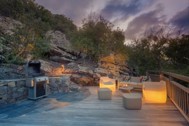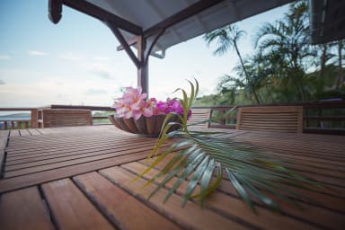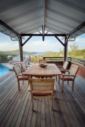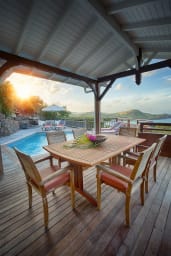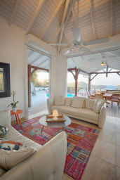 La terrasse dévoile un panorama exceptionnel sur le lagon et la plage de Petit-Cul-de-Sac. La piscine privée, avec ses larges marches, invite à la baignade et à la détente, tandis que les transats, à l’ombre des parasols, offrent un espace parfait pour se prélasser. Un salon extérieur cosy complète l’ensemble, face à la vue spectaculaire.