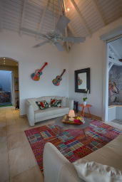 Conçue dans un esprit d’ouverture pour accueillir les alizés, la villa dispose d’un salon TV confortable avec écran plat, deux élégants canapés et quelques touches ethniques dans la décoration. La cuisine attenante est entièrement équipée et fonctionnelle, tandis que la salle à manger extérieure sous la terrasse couverte est idéale pour partager des repas conviviaux dans la douceur du climat caribéen.