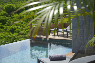 La vaste terrasse en bois comprend une piscine à débordement de 15 mètres, un petit coin repas extérieur et des transats – le tout face à la mer. Un cadre parfait pour se détendre en toute sérénité. Vous profiterez également de la proximité directe avec la sublime plage de Flamands, pour savourer des moments au soleil, faire une partie de volley-ball sur le sable ou explorer les fonds marins en snorkeling.