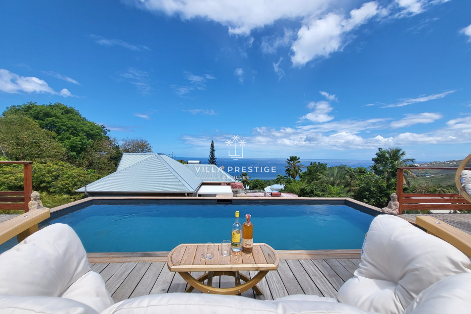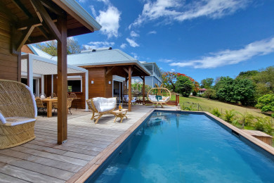 La terrasse en bois, tournée vers la mer, offre un cadre idyllique pour la détente : piscine privative, transats, fauteuils suspendus et salon extérieur invitent à la relaxation. Une grande table à manger sous pergola permet de partager les repas en plein air. Depuis la terrasse, la vue panoramique sur les Îlets Pigeon et les montagnes offre un spectacle permanent, notamment au coucher du soleil.