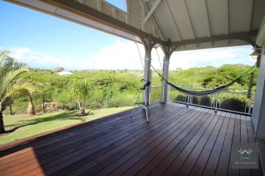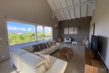 La villa dispose de deux salons confortables, d’un grand carbet traditionnel, et d’une cuisine ouverte entièrement équipée. L’espace extérieur offre avec salon extérieur et transats face à la mer. Une salle de sport climatisée complète les équipements avec tapis de course, vélo, rameur, steppeurs, chaîne hi-fi.