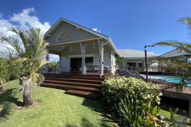 La piscine à débordement au sel est entourée d’un deck spacieux de 150 m². Vous profiterez d’un carbet, d’un salon extérieur, d’une plancha et de transats avec vue panoramique. Un générateur, une citerne d’eau, une table de ping-pong et des aquabikes sont à votre disposition.