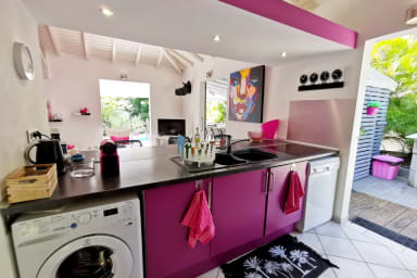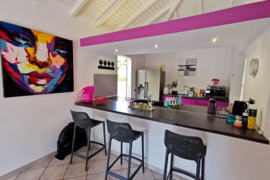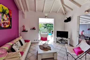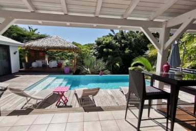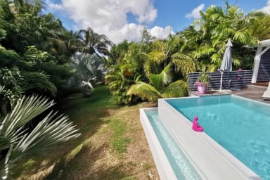 La villa s’ouvre sur un bel espace extérieur, entouré d’un jardin tropical luxuriant. La piscine privée, bordée de transats et de touches colorées, invite à la détente sous le soleil. Une terrasse couverte accueille un salon et un coin repas conviviaux, tandis qu’un carbet en bois, à l’écart, offre un espace lounge intimiste, parfait pour l’apéritif ou un moment de calme.