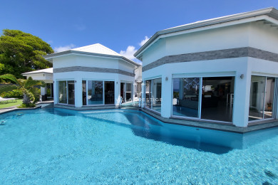 L’immense piscine à débordement borde directement les pièces de vie, créant une belle continuité dedans-dehors. Le jardin paysager accueille plusieurs coins détente : transats avec vue mer, salon ombragé pour l’apéritif, grand carbet aménagé et espace barbecue. Un jacuzzi vous attend également pour vos moments de relaxation.