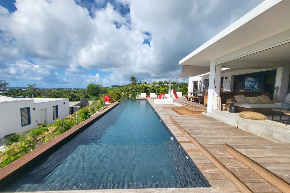 La terrasse de plus de 100 m² offre une vue imprenable sur la mer et l’aérodrome de Saint-François. L’espace extérieur comprend une piscine de 16 mètres, un espace repas, un salon extérieur cosy avec de grands fauteuils et canapés, ainsi qu’une baignoire extérieure avec vue sur l’horizon.