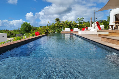 La terrasse de plus de 100 m² offre une vue imprenable sur la mer et l’aérodrome de Saint-François. L’espace extérieur comprend une piscine de 16 mètres, un espace repas, un salon extérieur cosy avec de grands fauteuils et canapés, ainsi qu’une baignoire extérieure avec vue sur l’horizon.